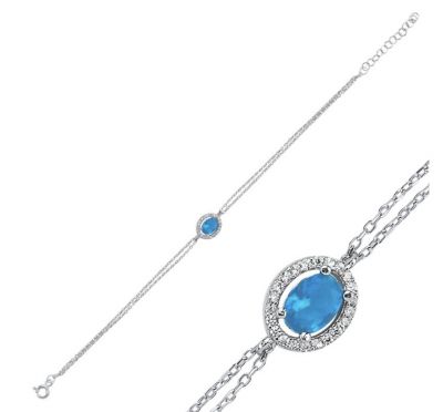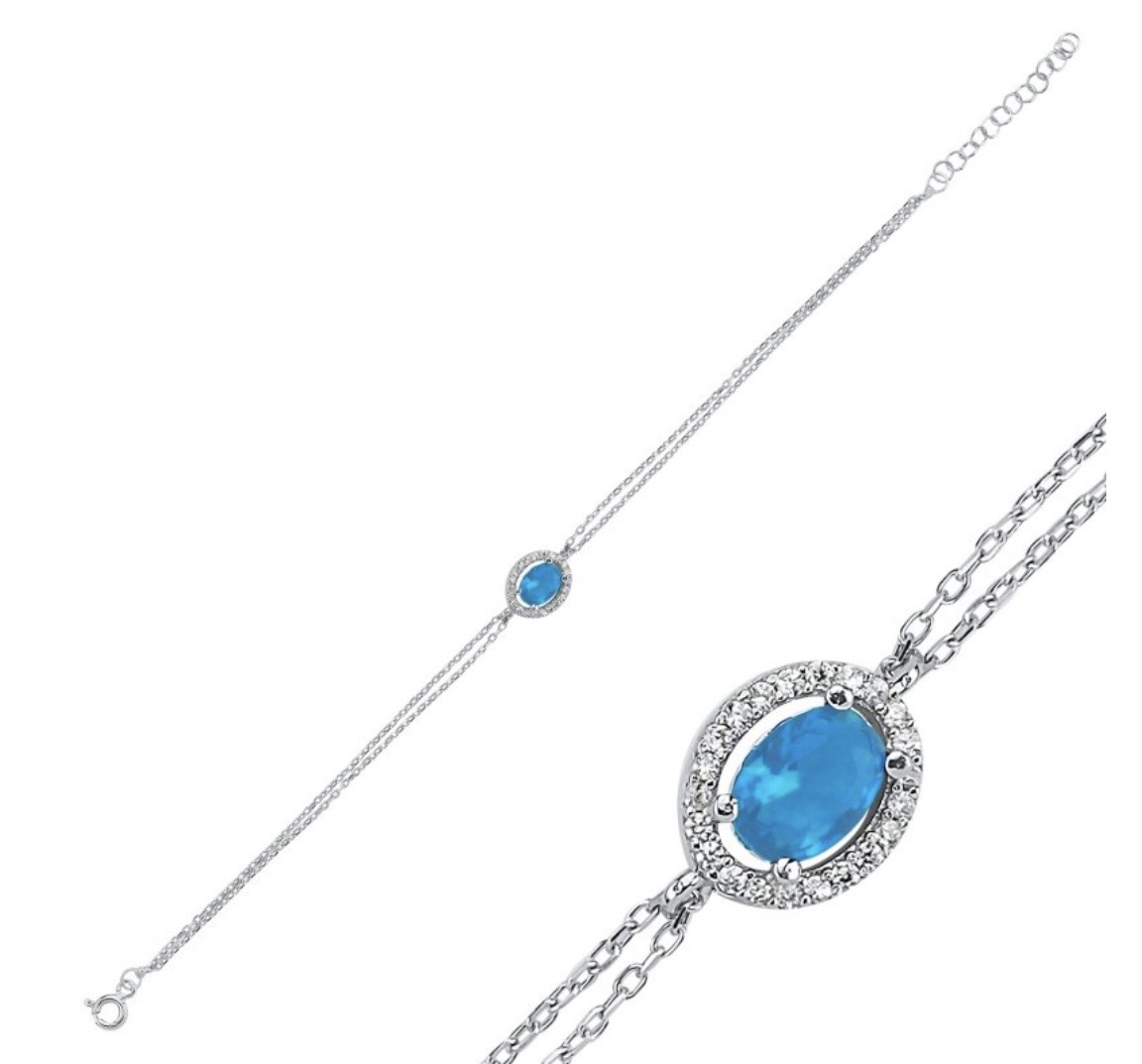 Srebrna narukvica lančana, sa kamenom akvamarin blue i cirkonima, prevučena rodijumom (ne tamni).