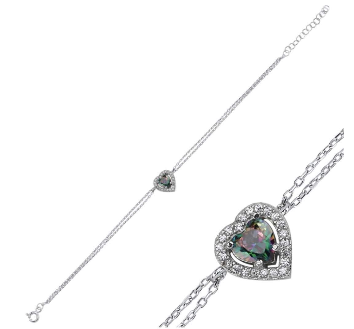 Srebrna narukvica sa priveskom srce od mistik topaz kamena, dodatkom cirkona, prevučena rodijumom.