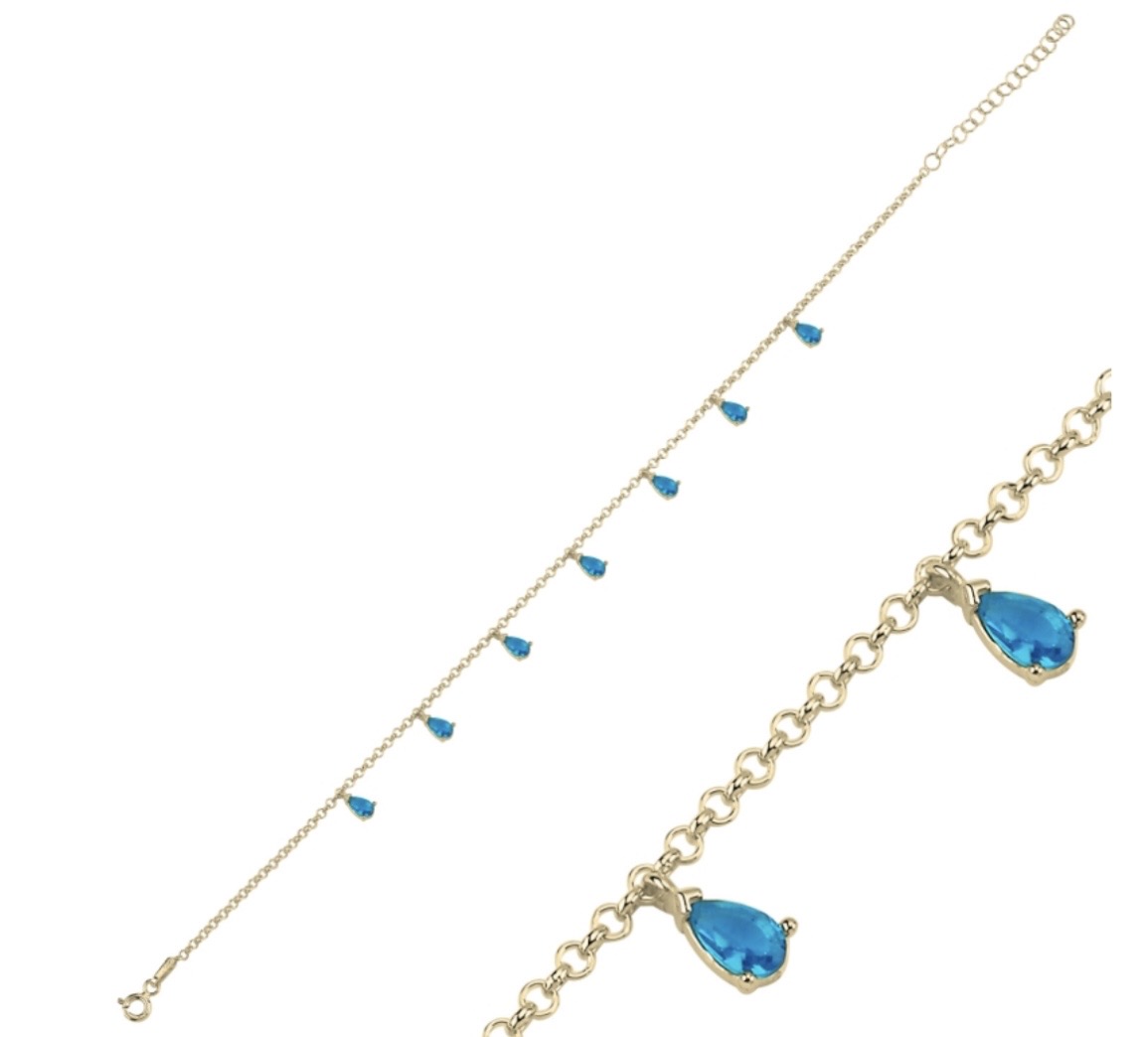 Srebrna narukvica sa privescima od akva marin kamena u pozlati.