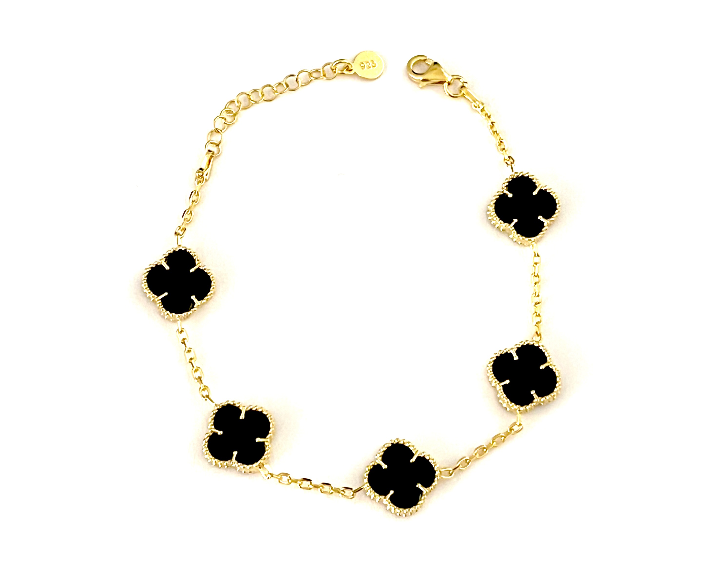Srebrna narukvica sa privescima deteline crne boje u pozlati.