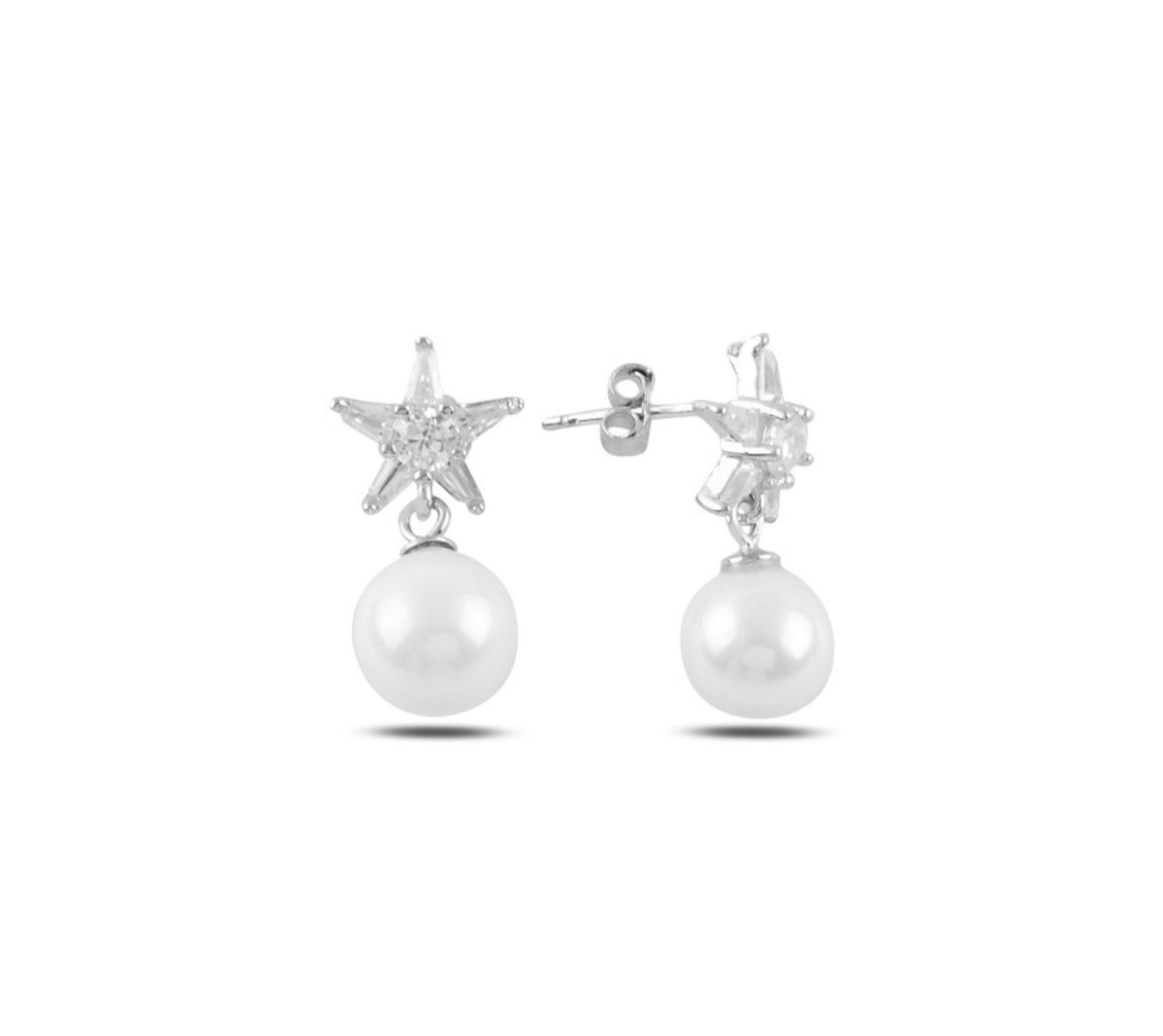 Srebrne minđuše zvezde sa cirkonima i belim biserom, kopča šraf.