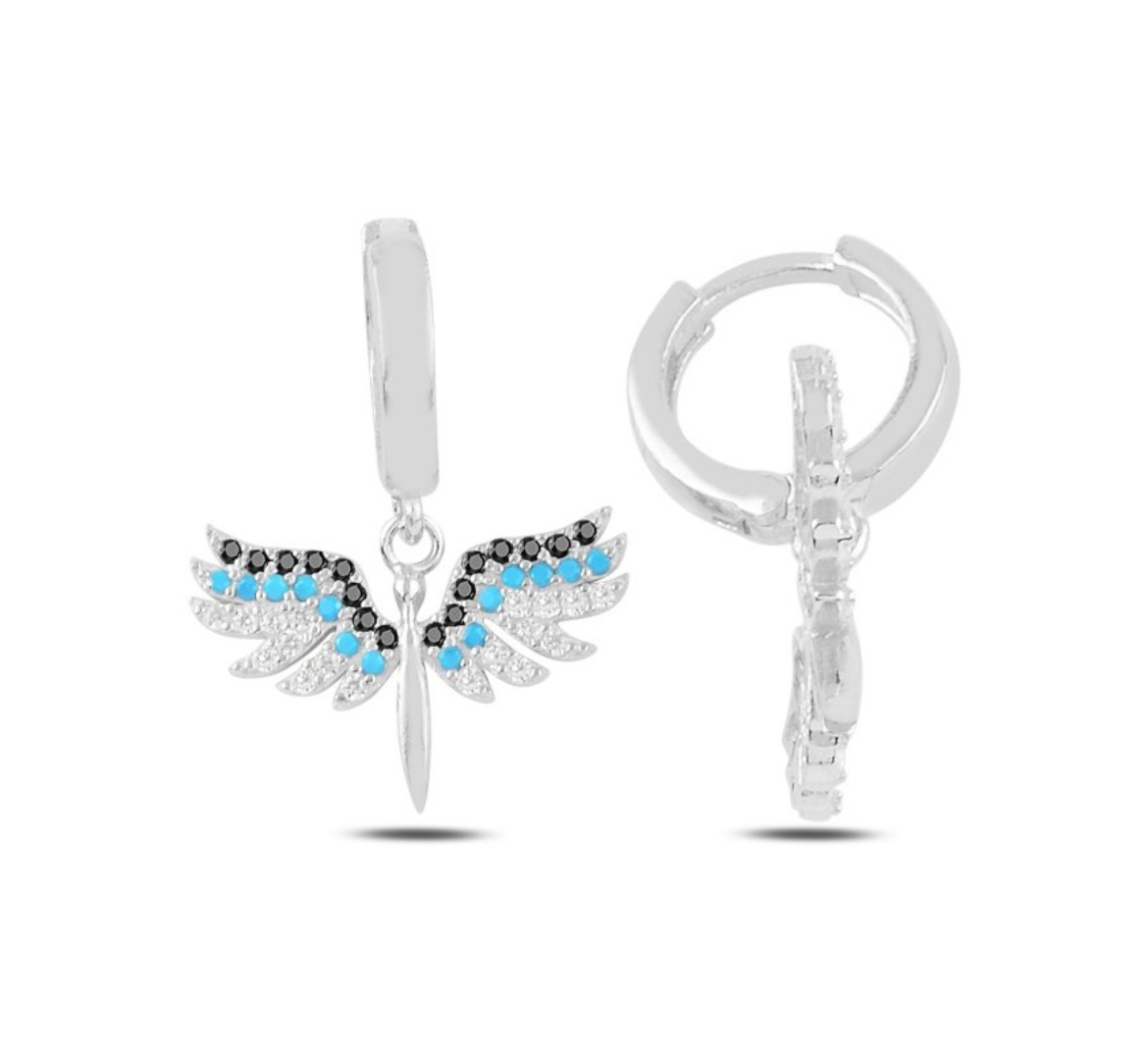 Model - srebrne minđuše sa priveskom krila od raznobojnih cirkona, prevučene rodijumom, kopča alka.