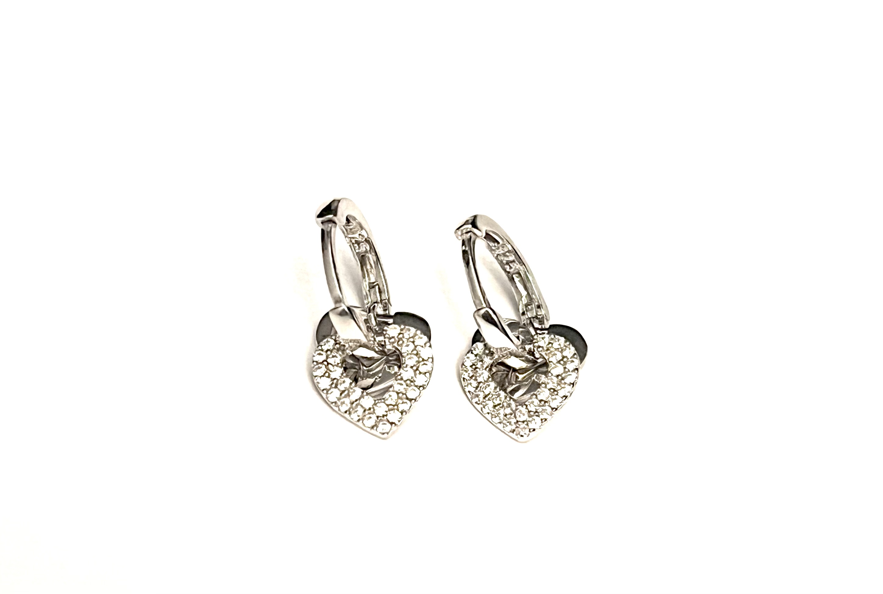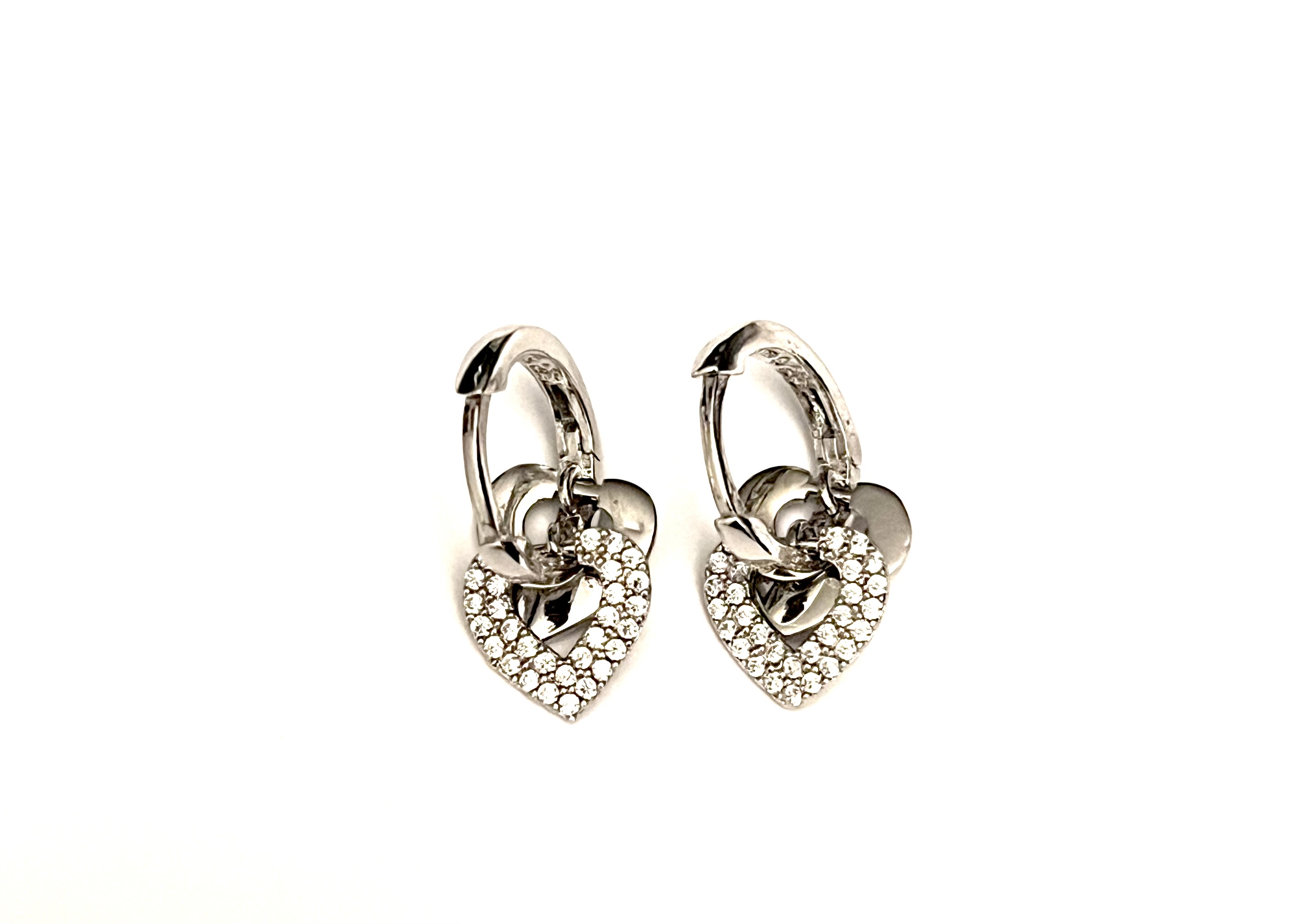 Srebrne minđuše sa priveskom u obliku srca na alkama, sa dodatkom cirkona, prevučene rodijumom (ne tamne).