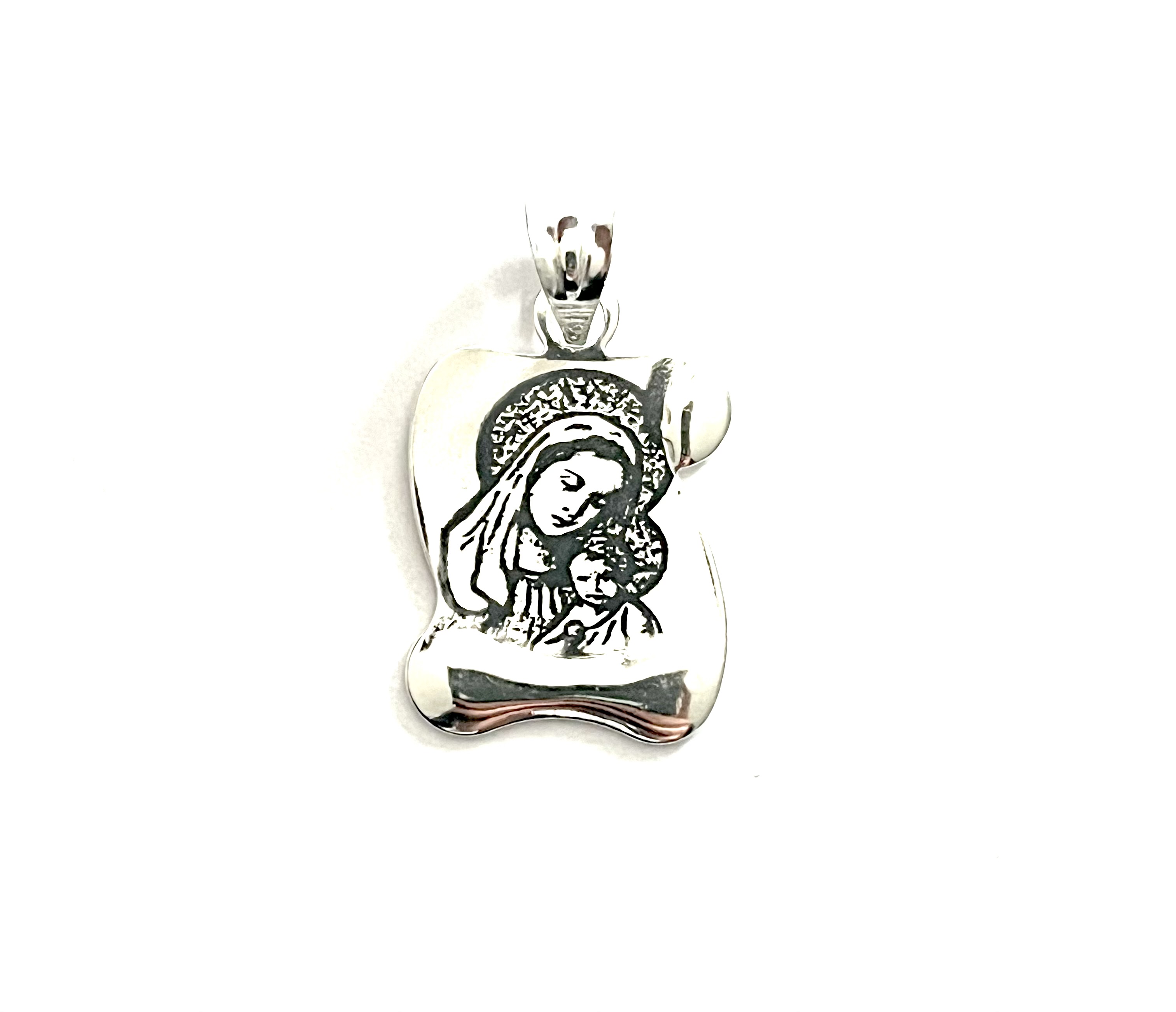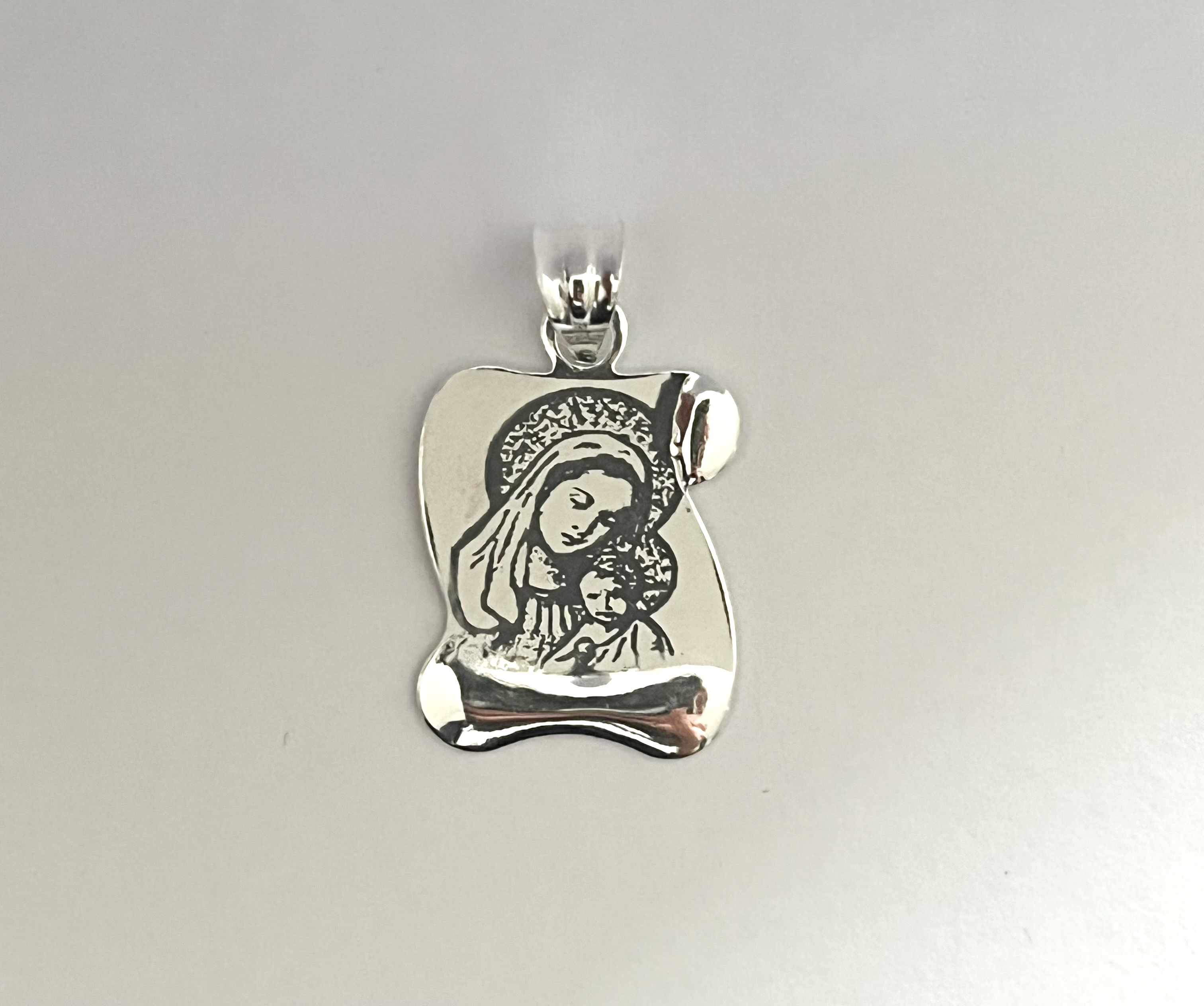 Srebrni privezak sa radom i likom Bogorodice, od čistog glat srebra.